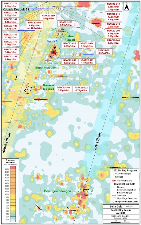 October 4, 2022 – Bedford, Nova Scotia – Sylla Gold Corp. (TSX.V:SYG); (OTCQB:SYGCF) (“Sylla Gold” or the “Company”) is pleased to announce additional positive gold assay results from 212 air core (AC) drill holes totalling 10,600 m completed on gold anomaly target areas previously defined by both termite and soil sampling. These anomalies occur at various locations all within the Company’s Niaouleni Gold Project (“Niaouleni”) in Southern Mali (Figure 1).