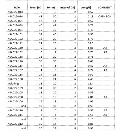 A summary of significant gold assay intercepts of these AC holes is shown in Table 1