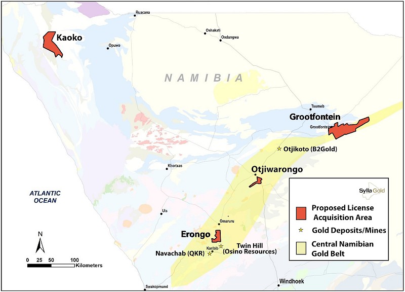 Regan Isenor, President and CEO of Sylla, commented, “The Company is very pleased to acquire such an extensive land package of prospective ground in a truly emerging gold district. The Central Namibian Gold Belt continues to produce world class gold operations as well as new discoveries and we’re looking forward to unlocking the value in these licences by applying some of the knowledge gained from the recent discoveries in the district. The licences Sylla is acquiring were assembled in proximity and on strike of significant operating gold mines and recent discoveries in favorable geology conducive to mineralization.”